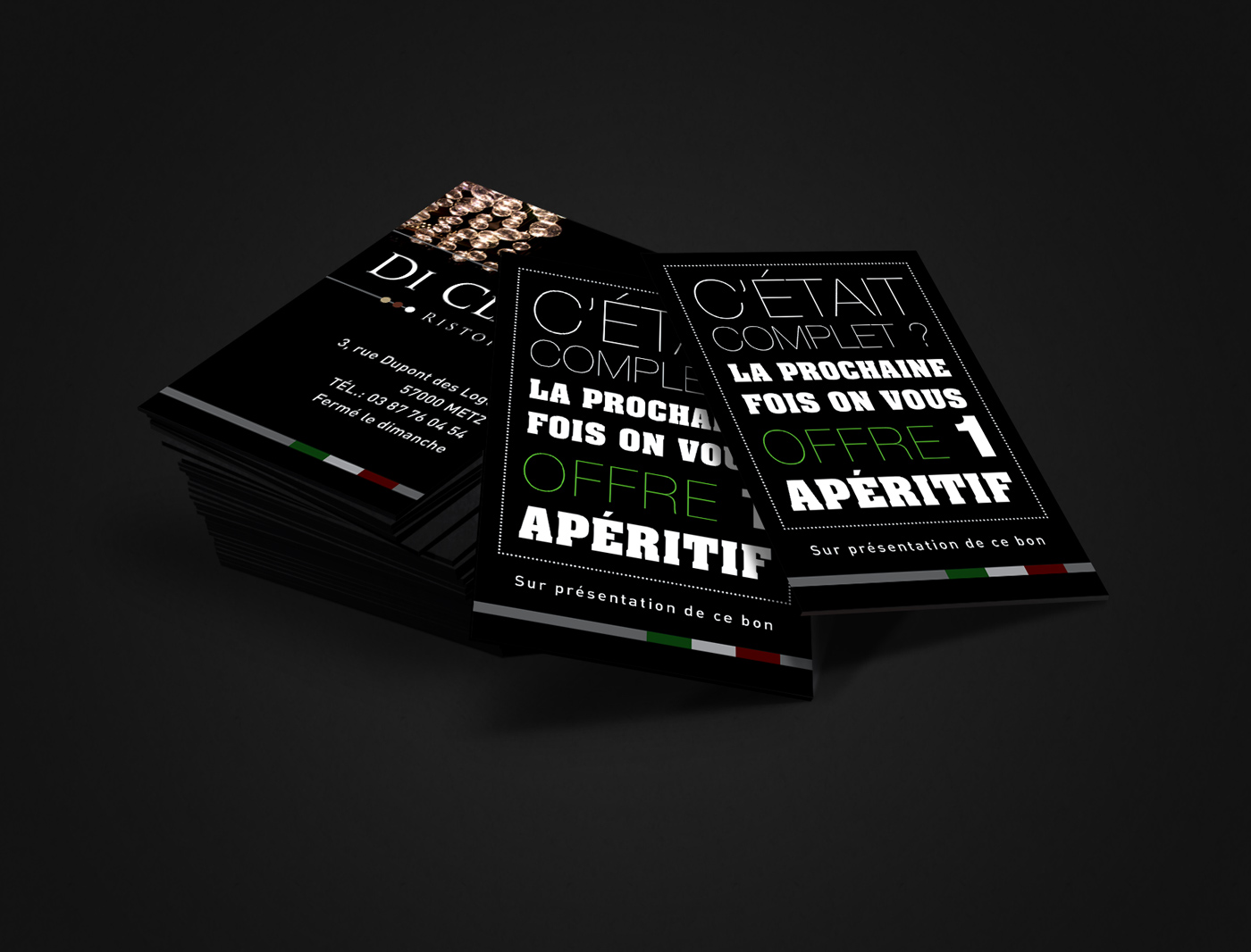 De cartes de visites avec offre promotionnelle pour le restaurant Di Clara à Metz.
