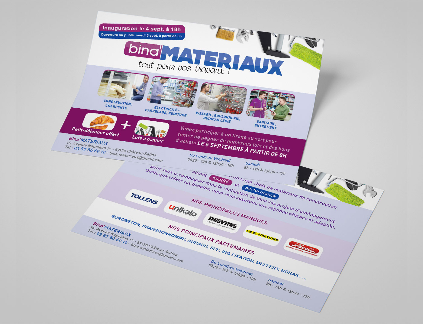 Création d’un flyer recto verso pour Bina’Matériaux, magasin spécialisé dans la fourniture.