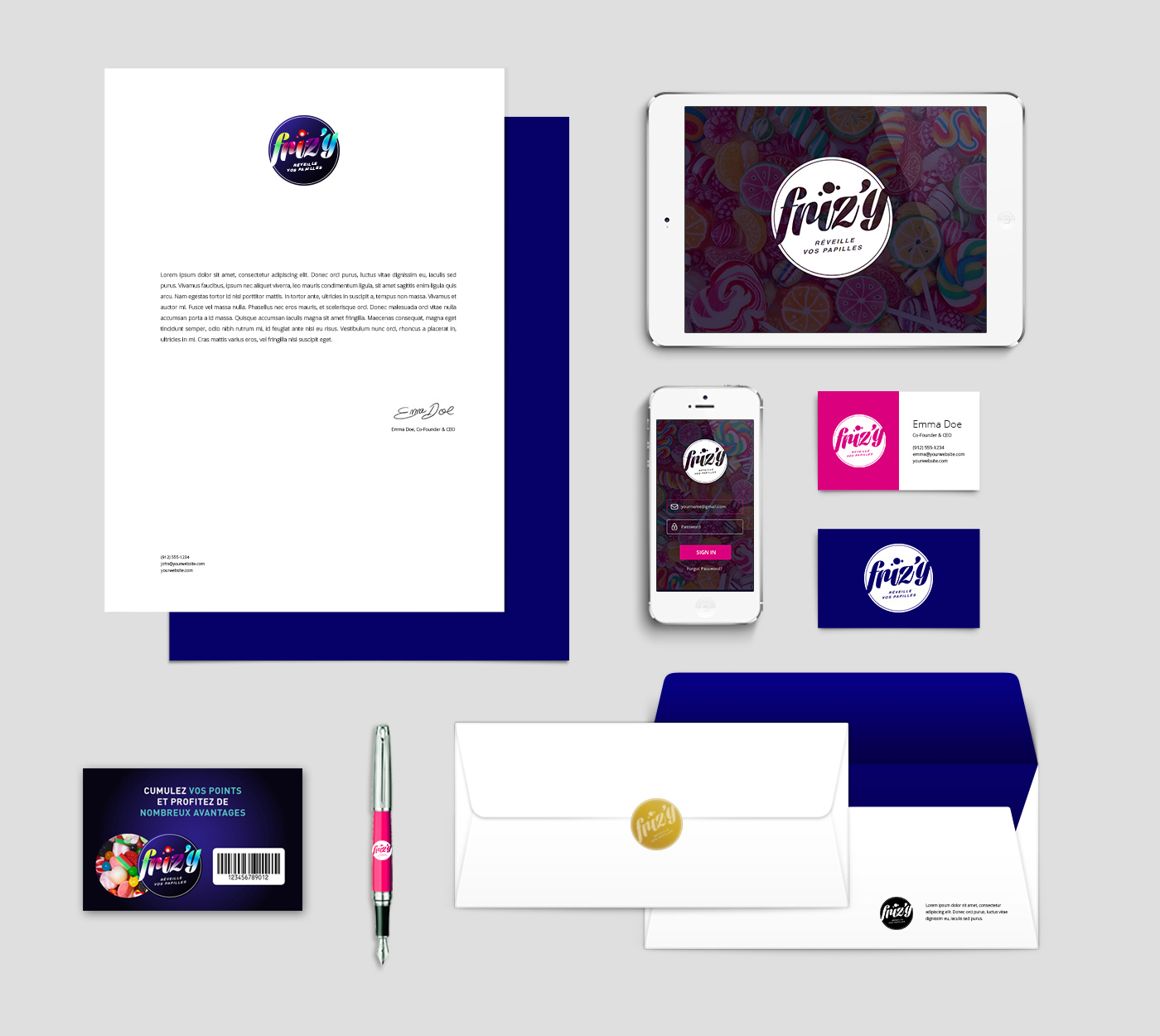 Friz’y réveille vos papilles en vous proposant une large gamme de bonbons colorés et originaux. J’ai réalisé pour le client l’identité visuelle et le logo de la marque, en déclinant également différents supports de communication adaptés au projet.